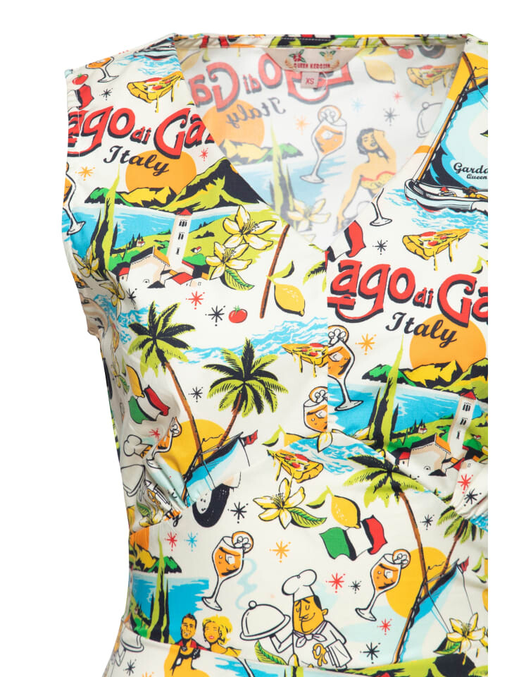 Наслаждайтесь солнечными днями и сладкой жизнью в свободном платье без рукавов от Queen Kerosin. Это платье воплощает беззаботное очарование итальянского лета и превращает каждый день в праздник сладкой жизни. Благодаря детальному принту по всей поверхности, изображающему аперитивы на закате и ощущение свободы на скутере, он привлекает всеобщее внимание. V-образный вырез придает платью элегантность, а разделительный шов под грудью обеспечивает приятную посадку. Юбка А-силуэта широкого кроя плавно движется при каждом движении и делает платье звездой, особенно на танцевальных мероприятиях. Платье из смеси хлопка и эластана обеспечивает прохладу и комфорт даже в самые жаркие дни. Наслаждаетесь ли вы отдыхом на озере Гарда или прогуливаетесь по старым улицам соседнего города, это платье превратит любую обстановку в подиум. С каждым вашим шагом вы будете чувствовать, будто прогуливаетесь по живописным улочкам Италии.