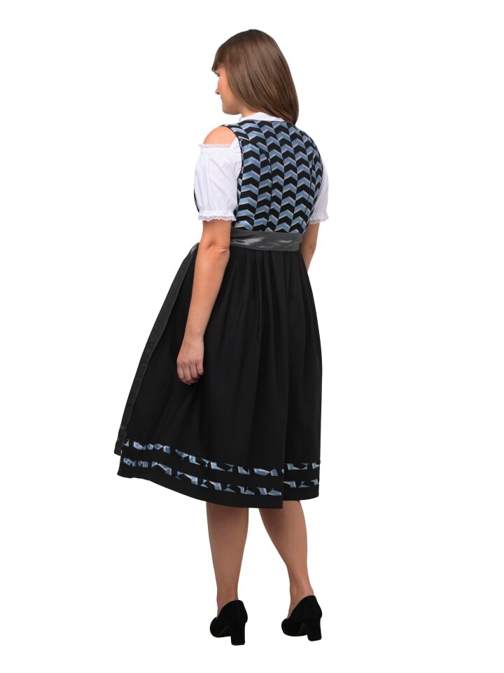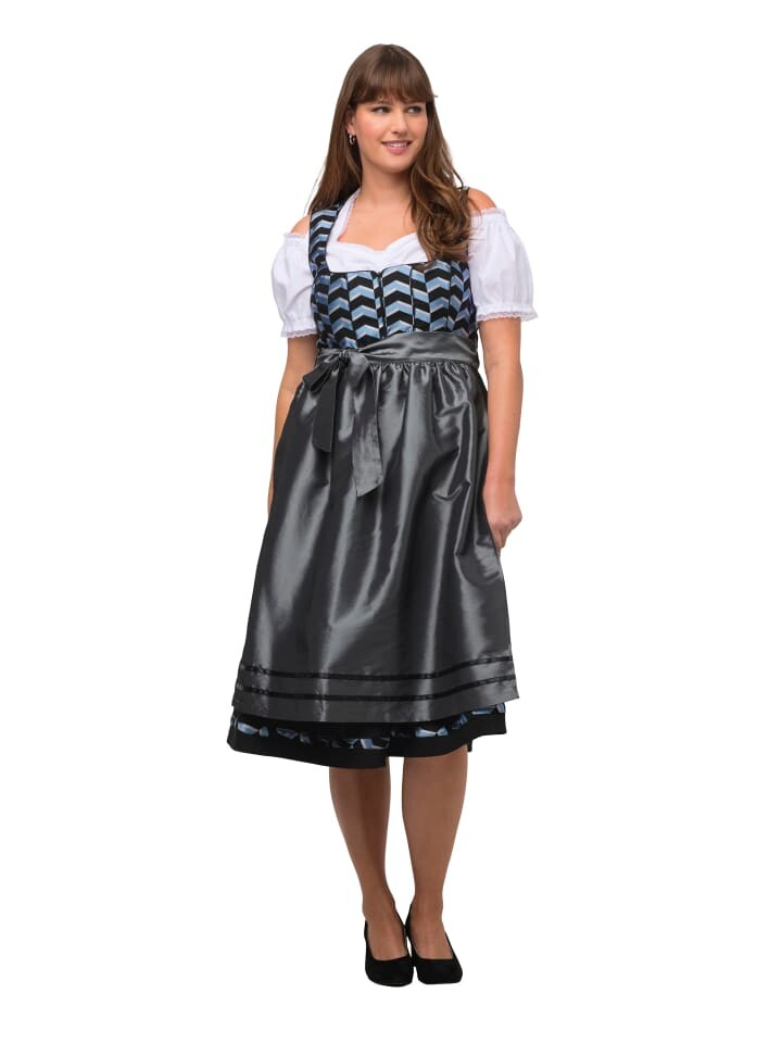 Дирндль с зигзагообразным узором сверху. Непрерывная молния с тонким швом. Отделка окантовкой по краям. Без рукавов, с квадратным вырезом и широкой юбкой. Карманы в боковых швах, в тон фартуку.