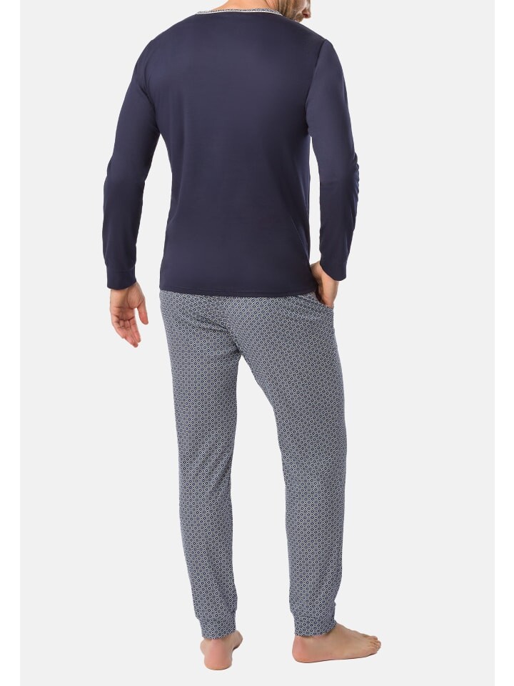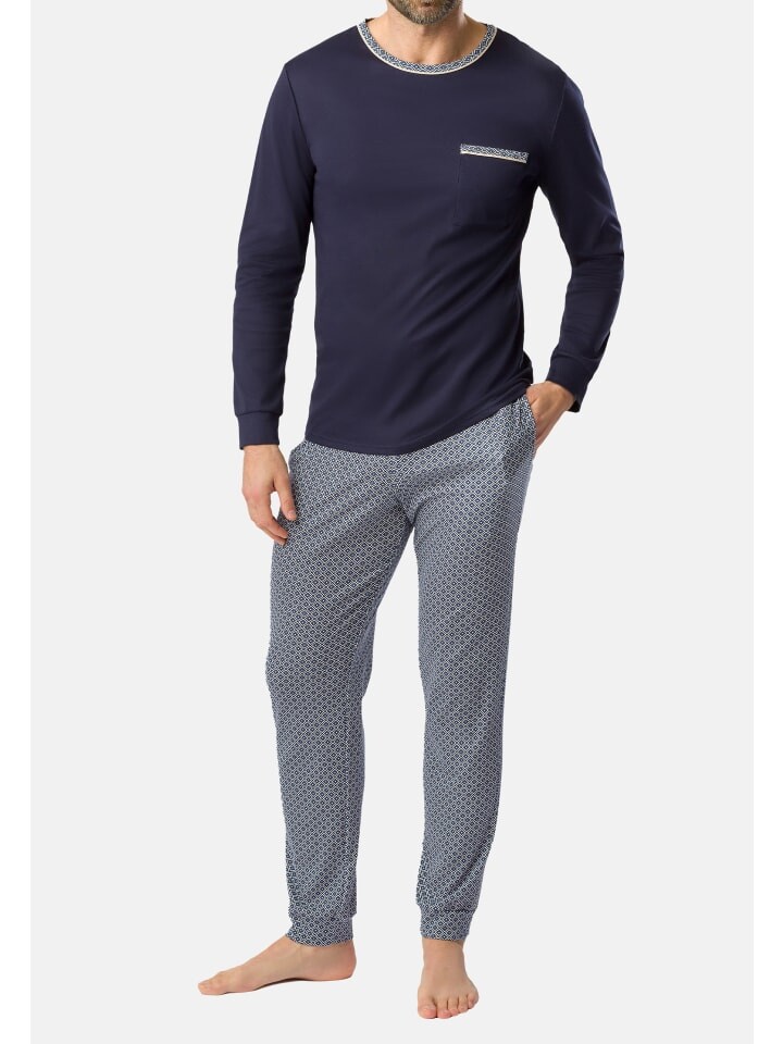 Пижамы также отвечают самым высоким требованиям! Эластичная резинка на рукавах и манжетах на штанинах делает пижаму особенно удобной и обеспечивает идеальную посадку. Верх также имеет контрастный по цвету круглый вырез и накладной нагрудный карман, что делает его особенно привлекательным. Изюминкой пижамы является окантовка горловины и нагрудного кармана.