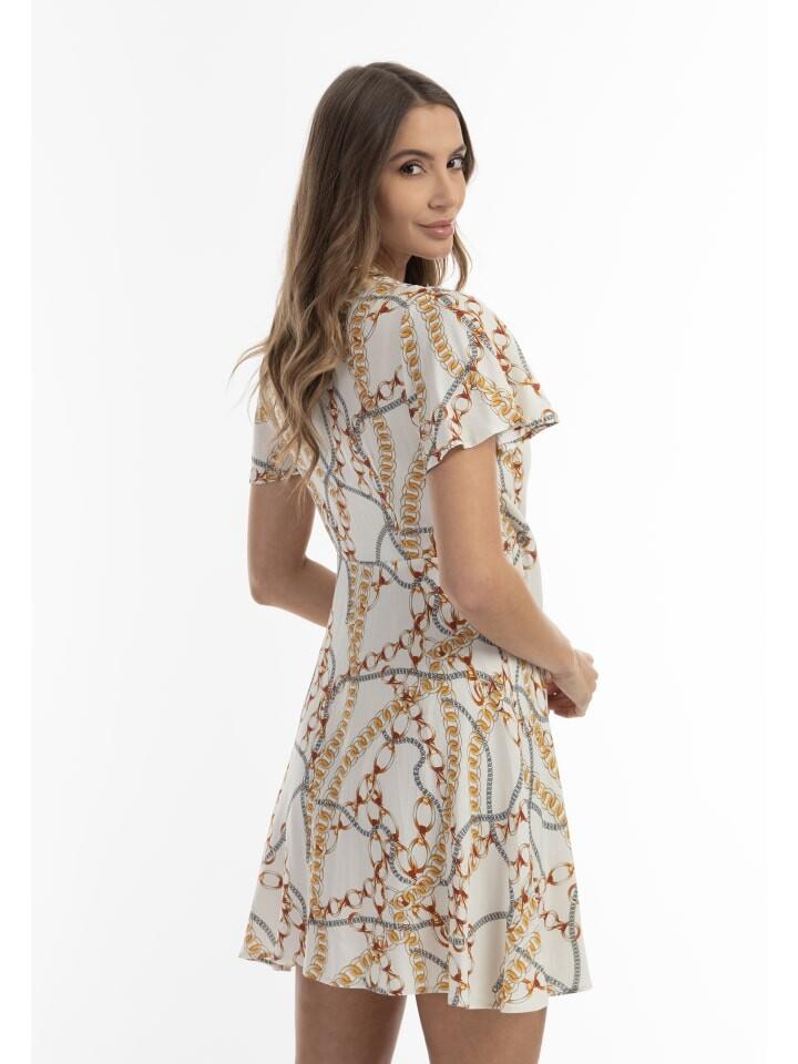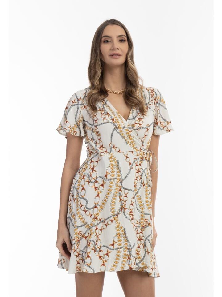 Это творение Faina символизирует чистый гламур. Оно изготовлено в Италии из мягкой, струящейся вискозы, имеет укороченный крой и лиф с запахом. Изысканный принт с золотыми цепочками и короткие рукава дополнены эластичной талией, которую дополнительно подчеркивает пояс. Носите элегантное летнее платье с любимыми туфлями или вечерними туфлями на высоком каблуке.