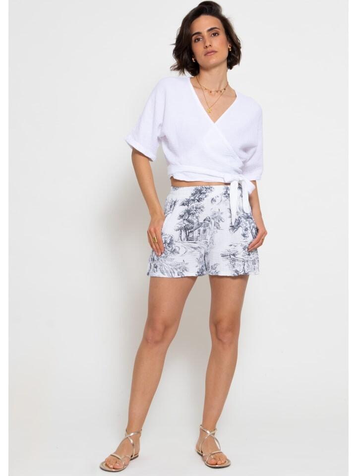 Наслаждайтесь летней свежестью, которую наша муслиновая блузка с запахом привнесет в ваш гардероб. Модель отличается высококачественной муслиновой структурой, которая обеспечивает приятную мягкость на коже. Изысканный дизайн со встроенным отверстием позволяет легко продеть галстук и завязать его сбоку, создавая привлекательный силуэт. Благодаря V-образному вырезу и коротким широким рукавам оно придаст любому наряду непринужденную элегантность. Этот топ с запахом незаменим в сочетании с повседневными джинсами или стильными шортами.