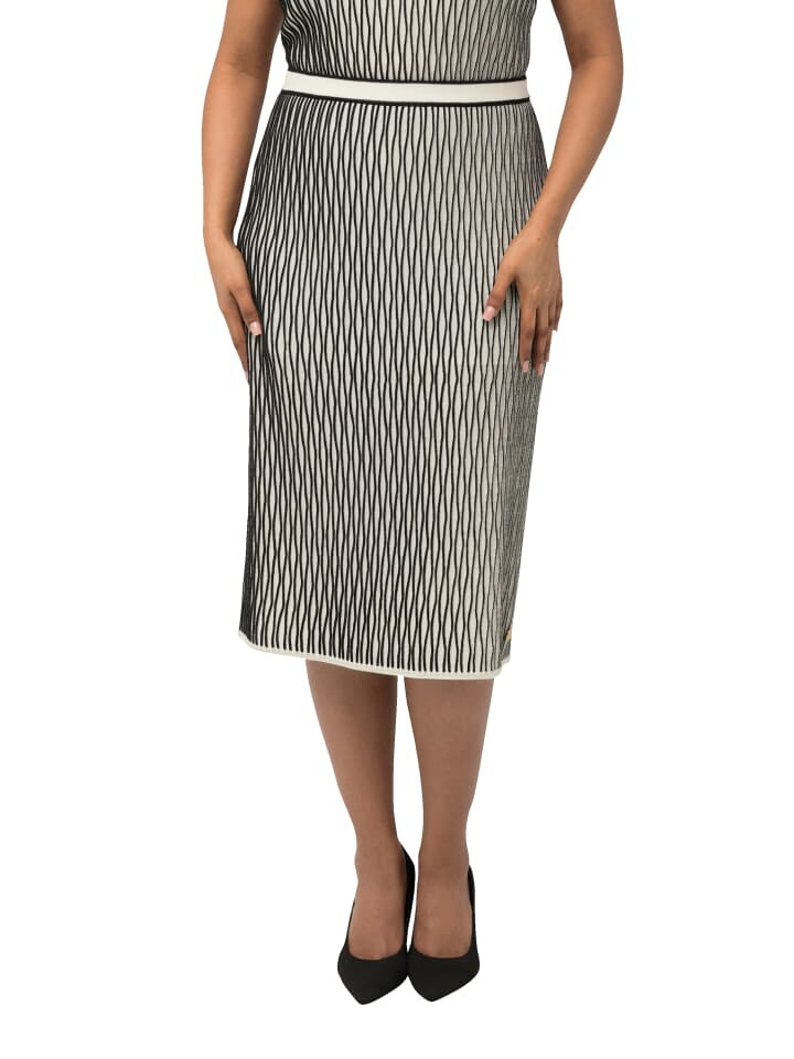 Трикотажная юбка прямого кроя из высококачественной смесовой шерсти с тонкой объемной структурой и эластичным поясом.