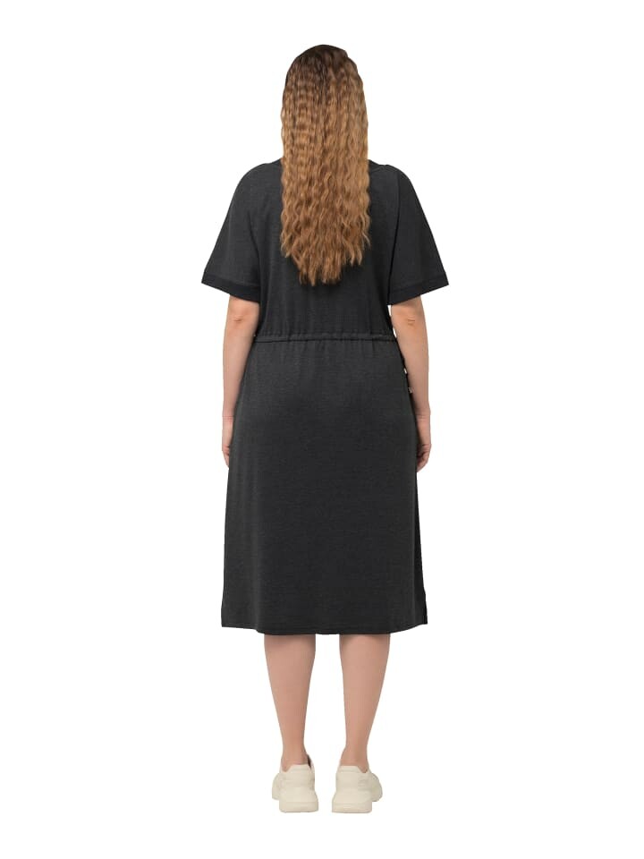 Платье из джерси, короткое А-силуэта, с кулиской и завязками по бокам под грудью. V-образный вырез с ребристой отделкой, заниженная линия плеча, ребристые манжеты.