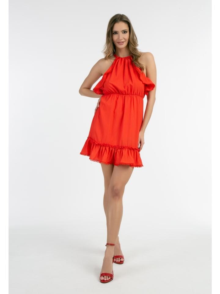 Этим летом мы снова были впечатлены женственным стилем Faina. В этой модели с воротником-халтер акцент сделан на боковых воланах с кружевной отделкой и рюшах на юбке. Легкий и слегка эластичный материал также обещает высокий уровень комфорта. Игривый, но элегантный образ можно создать с высокими босоножками и простой сумочкой.