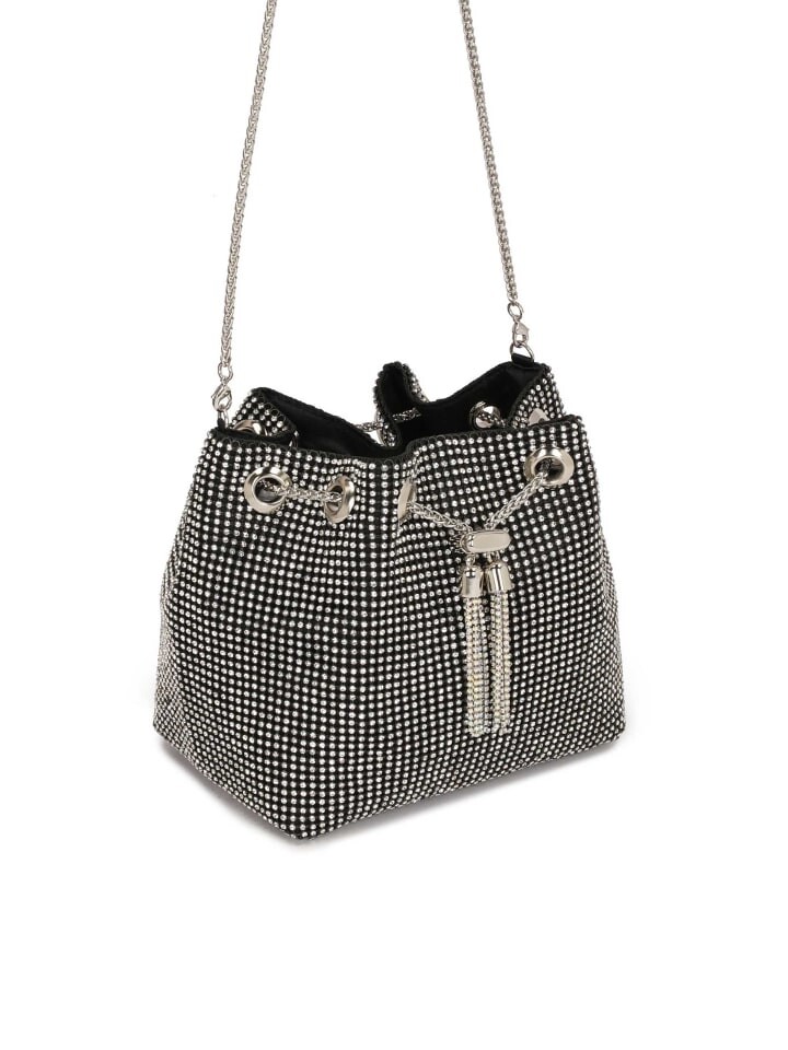 Феноменальная сумочка, полностью покрытая блестящими элементами из светло-черного пластика, эффектно дополнит вечерний образ. Благодаря богатому декору его можно использовать в качестве яркого декоративного акцента наряда. Свободная форма в виде сумки на ремешке красиво смотрится на цепочке.