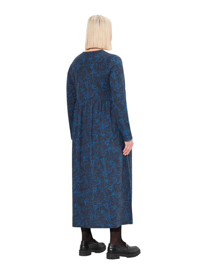 Трикотажное платье А-силуэта из чистого хлопка с декоративным узором. Женственная длина миди с декоративными лентами в круглом вырезе. Эластичный ампирный шов под грудью, карманы в боковых швах. Длинный рукав.