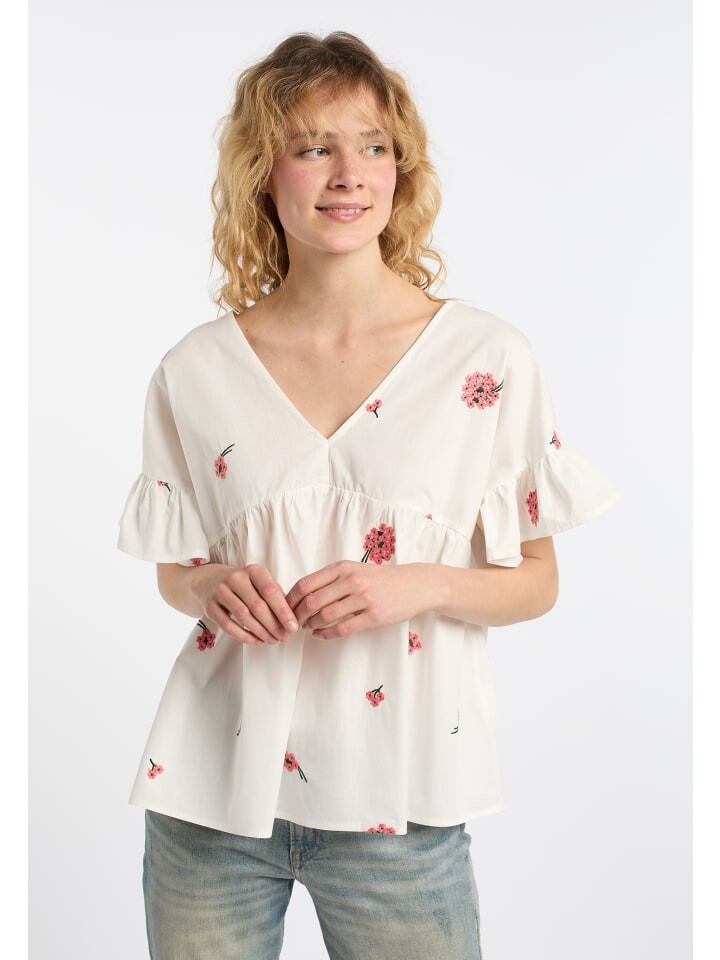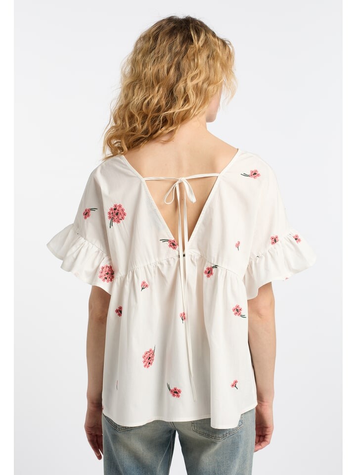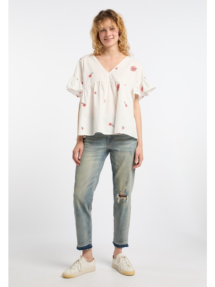 Нежная цветочная вышивка придает хлопковой блузке DreiMaster Vintage романтический оттенок. Но привлекательный V-образный вырез спереди и сзади, а также рюши на рукавах также добавляют визуальных акцентов. Благодаря чистому хлопку модель свободного кроя становится удобной трендовой вещью.