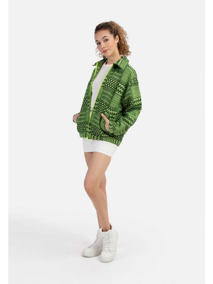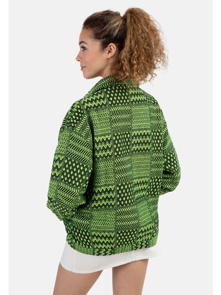 В прохладные летние дни или вечера зелено-черный блузон от myMo привлекает внимание. Жакет, сотканный из смесового хлопка, впечатляет модным лоскутным этническим узором с яркими неоновыми эффектами. Классический блузон с отложным воротником и двумя боковыми карманами. Мягкая внутренняя подкладка завершает дизайн.