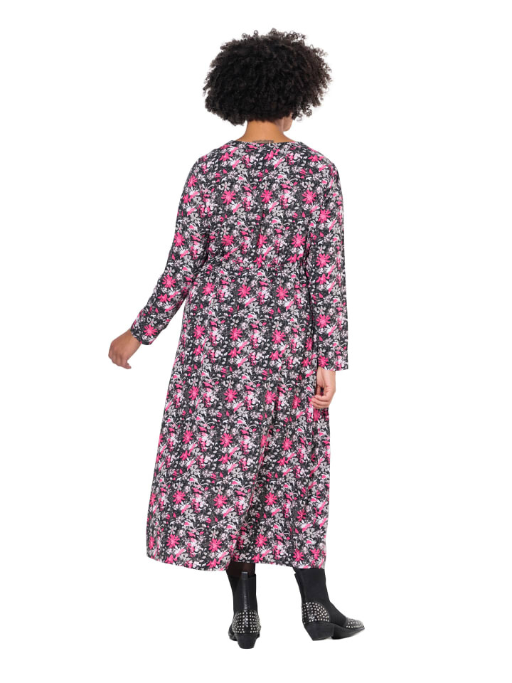 Платье-макси А-силуэта из мягкой вискозы с цветочным узором в камуфляжном стиле. Круглая горловина, талия на кулиске, длинные рукава. Внешний материал: 100% вискоза.