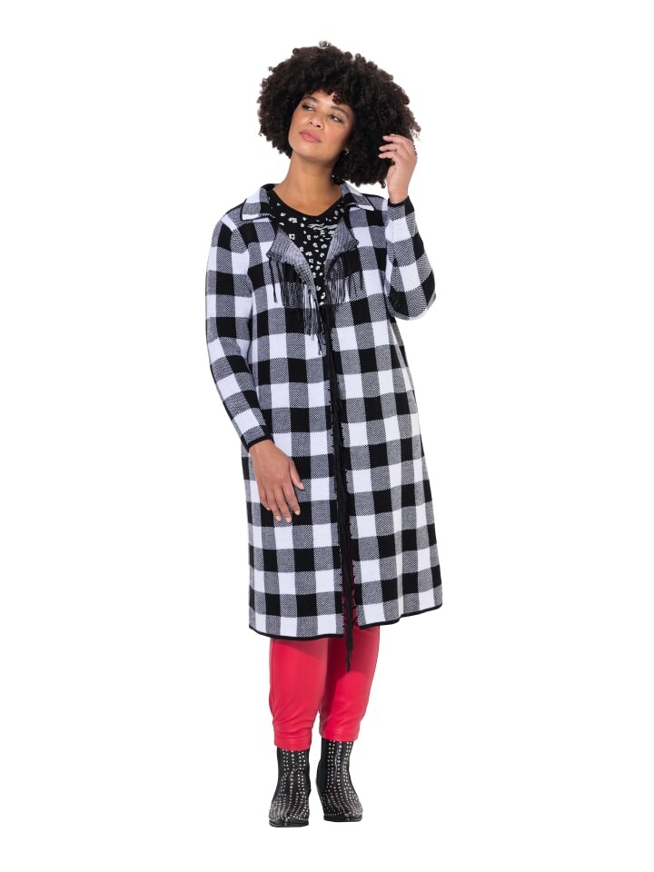 Кардиган прямого кроя из мягкой тонкой вязки с клетчатой клеткой и краями с бахромой. Открытый жакет с рубашечным воротником и краями с бахромой. Длинный рукав.