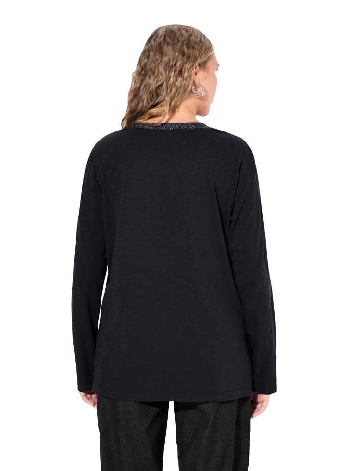 Футболка классического кроя, с блестящим трикотажем на горловине и планкой на половину пуговиц. Длинный рукав.