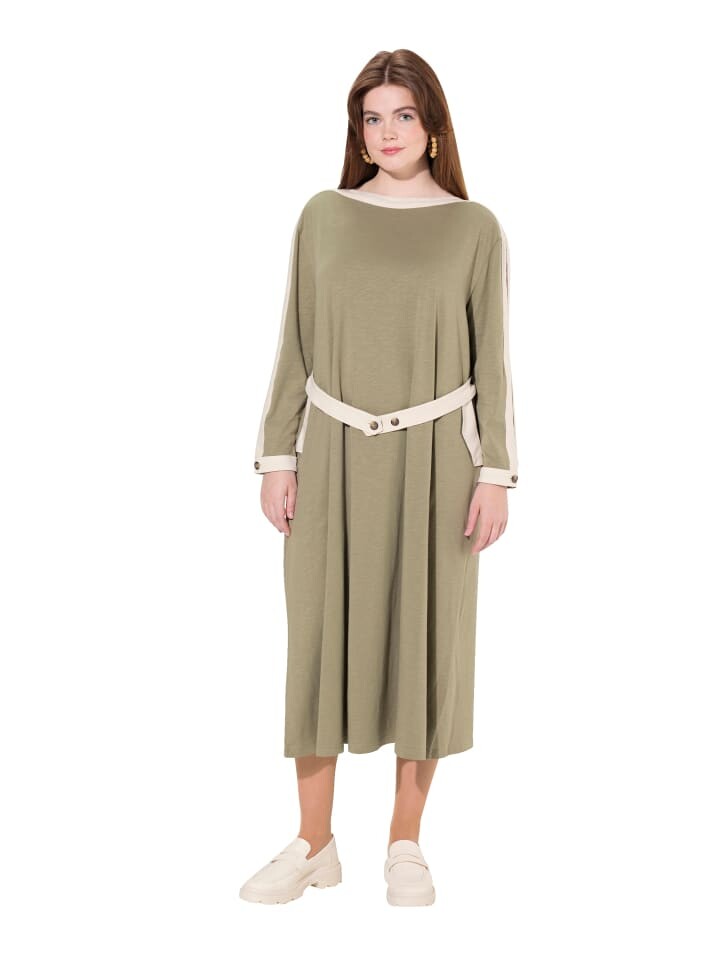 Платье миди из органического хлопка. А-силуэт со светлыми полосками на плечах и съемным поясом на талии – всегда силуэт вашей мечты. Вырез-лодочка, 2 кармана, длинные рукава. Органический; сертифицирован ECOCERT Greenlife, лицензия № 152026.