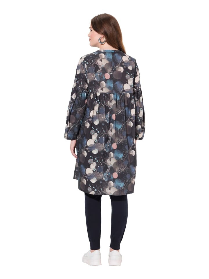Длинная блузка из натурального хлопка. Удобный А-силуэт с графическим рисунком и широкими объемными длинными рукавами. Круглый вырез горловины, планка с потайными пуговицами, снизу декоративная складка. Длинные боковые разрезы для еще большей свободы движений. Органический; сертифицирован ECOCERT Greenlife, лицензия № 152026.