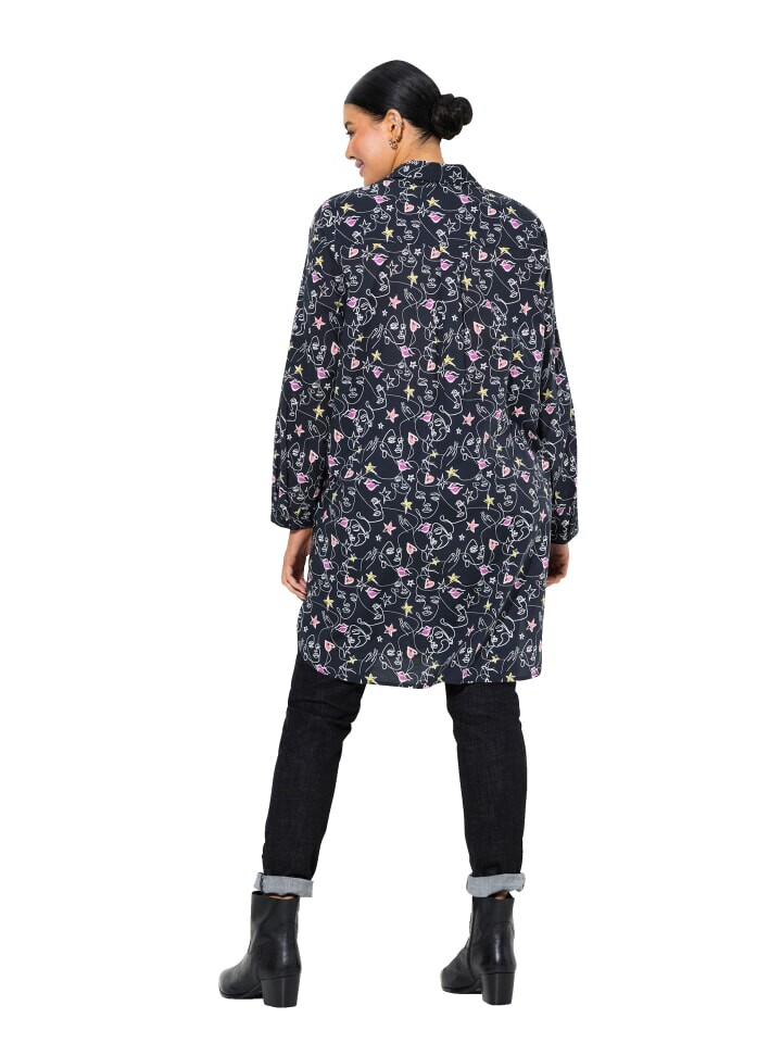 Длинная блузка удобного А-силуэта из мягкой ткани со стильным узором в виде сердечек. Воротник рубашки, длинные рукава с манжетами. Закругленный низ с длинными боковыми разрезами - еще больше свободы движений.