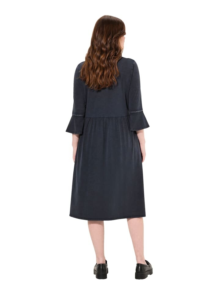 Трикотажное платье короткого А-силуэта из мягкого эластичного трикотажа с закругленными краями. Изюминка: V-образный вырез и волан на рукавах 3/4 с декоративными заклепками. Рельефный поперечный шов. Карманы в боковых швах.