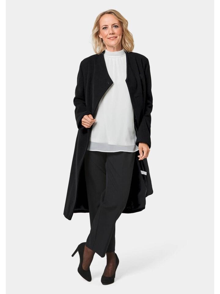 Шерстяное пальто выгодной длины – прекрасно сочетается с платьями и юбками. Пушистый, мягкий, с согревающим содержанием шерсти. Благодаря современной форме с воротником-стойкой оно выглядит невероятно шикарно как в открытом, так и в закрытом виде. С двумя накладными и двумя внутренними карманами. Матовые металлические пуговицы завершают стильный образ. Размер в длину около 108 см. 46, размер около 104 см. 23.