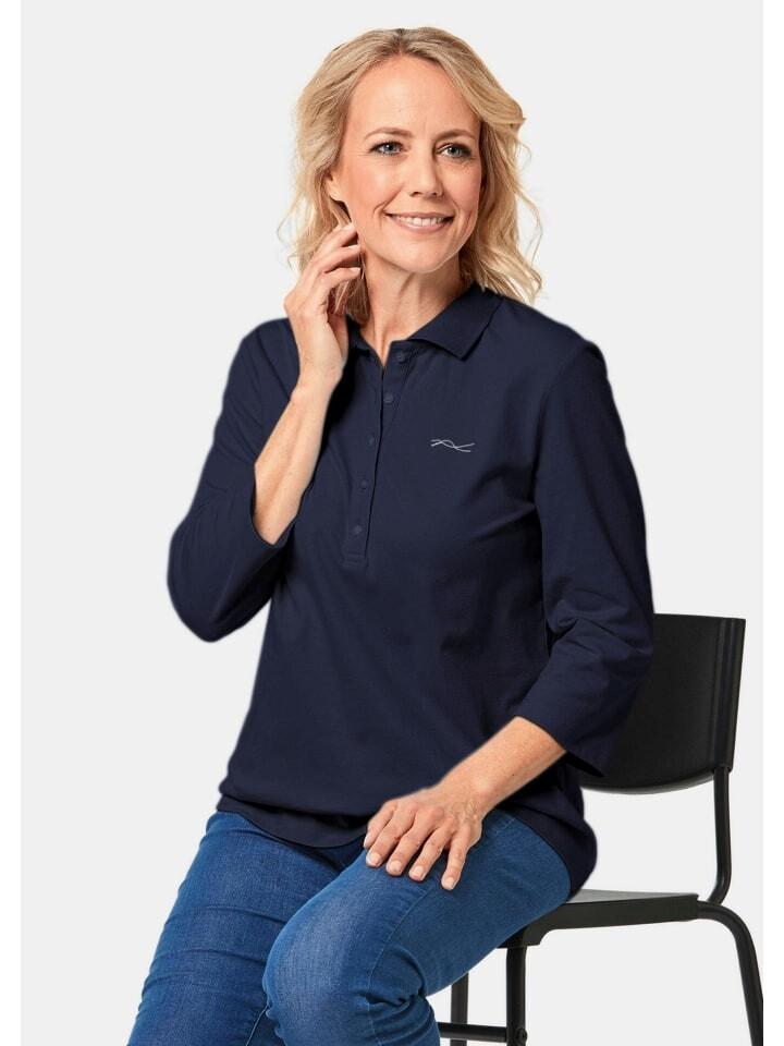 Рубашка-поло: универсальный компаньон с трикотажным воротником-поло и удобными рукавами 3/4. Слегка структурированное пике изготовлено из мягкой смеси хлопка и эластана. Блестящая вышивка спереди добавляет элегантный акцент. Пуговицы пришиты блестящими нитками. Заднее зеркало с глянцевым принтом. Длина около 66 см по размеру. 46, размер около 62 см. 23.