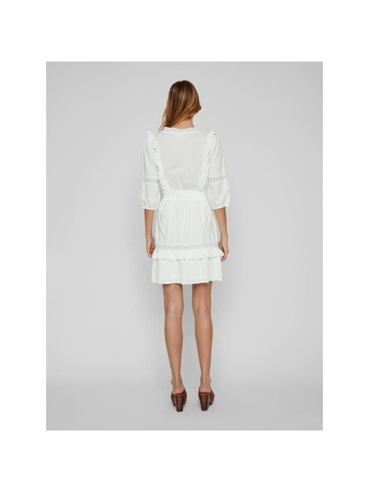 Мини-платье VILA «Акация» белого цвета, однотонные цвета, короткое платье, рукава 3/4, эластичный вырез на талии, V-образный вырез с кружевом, детали с рюшами, детали из кружева, эластичные манжеты на рукавах. Длина: 92 см для размера 38. Рукав длина: 42 см для размера 38. Рост модели 178 см, размер 38