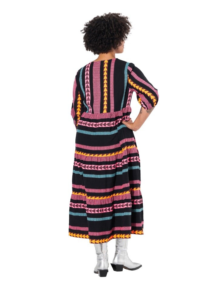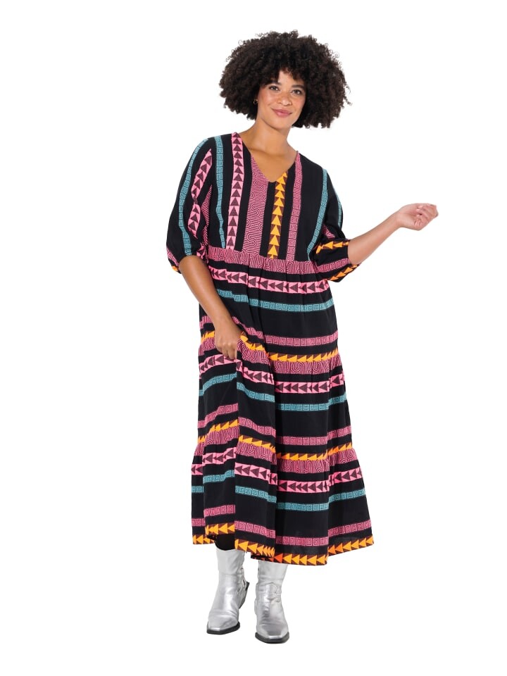 Платье макси А-силуэта с яркими жаккардовыми полосками. V-образный вырез, объемные рукава 3/4 с эластичными манжетами. Воланы по низу.