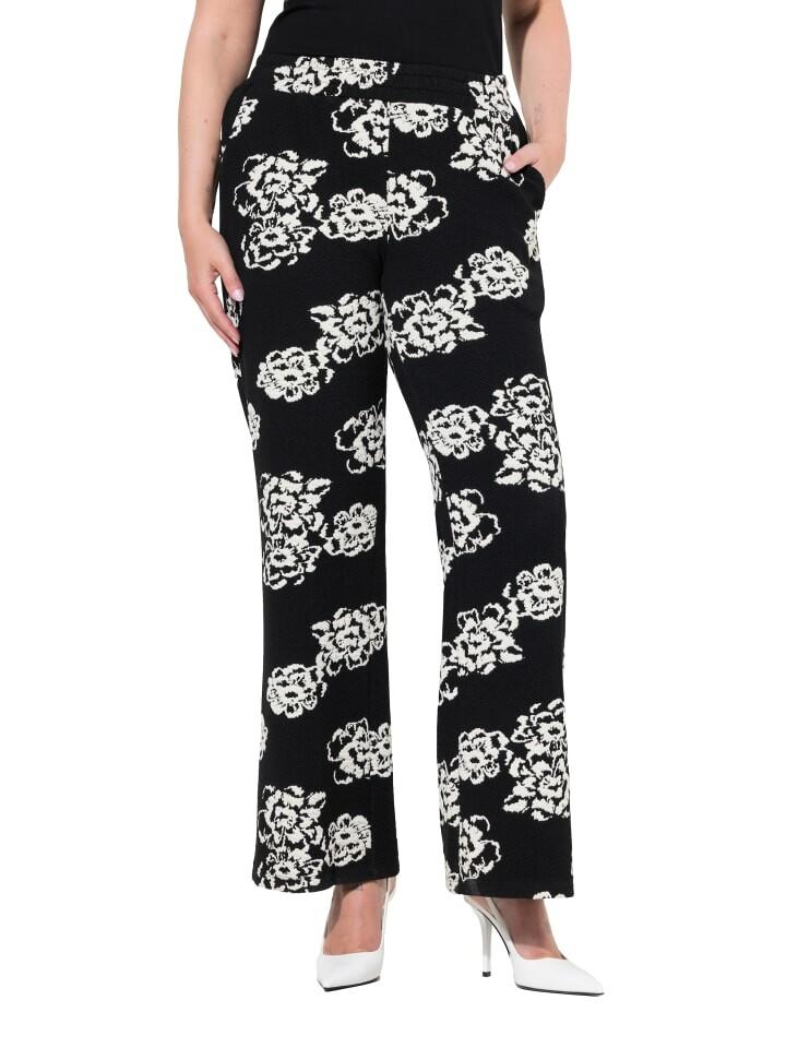 Брюки слегка расклешенные, с цветочным узором и эластичным поясом.