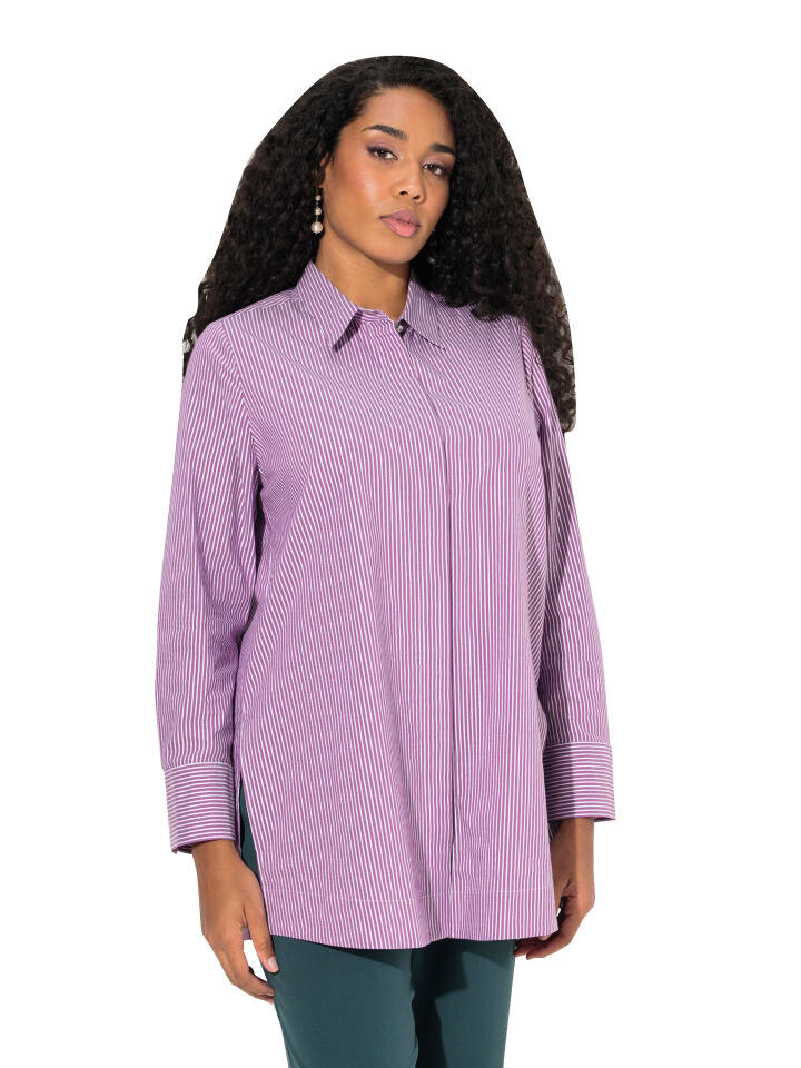 Блузка-рубашка, удлиненного классического кроя, в тонкую полоску. Воротник рубашки, планка на потайных пуговицах, длинные рукава с манжетами. Длинные боковые разрезы для плавного падения.