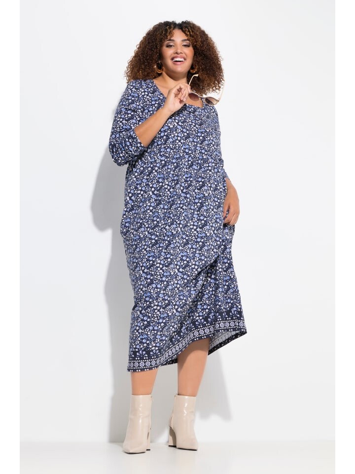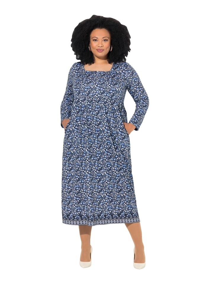 Трикотажное платье А-силуэта с узором по всей поверхности. Квадратный вырез горловины, эластичный ампирный шов под грудью, 2 кармана в боковых швах. Длинный рукав.