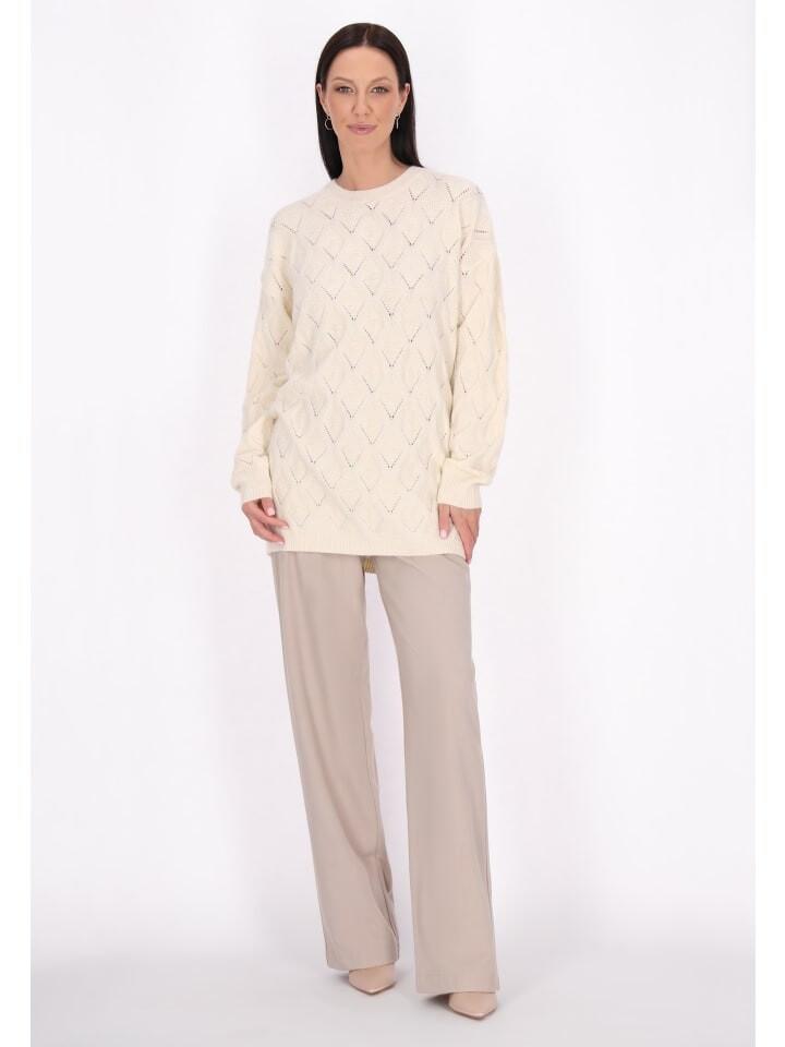 Откройте для себя изысканный свитер с круглым вырезом и длинными рукавами, украшенный замысловатым текстурным узором из повторяющихся ромбовидных форм, создающим стеганый эффект. Ребристый низ, манжеты и вырез горловины обеспечивают плотную посадку, а свободный силуэт обеспечивает комфорт. Это вязаное изделие, идеально подходящее в качестве верхней одежды для тепла и стиля, излучает роскошь и уют.