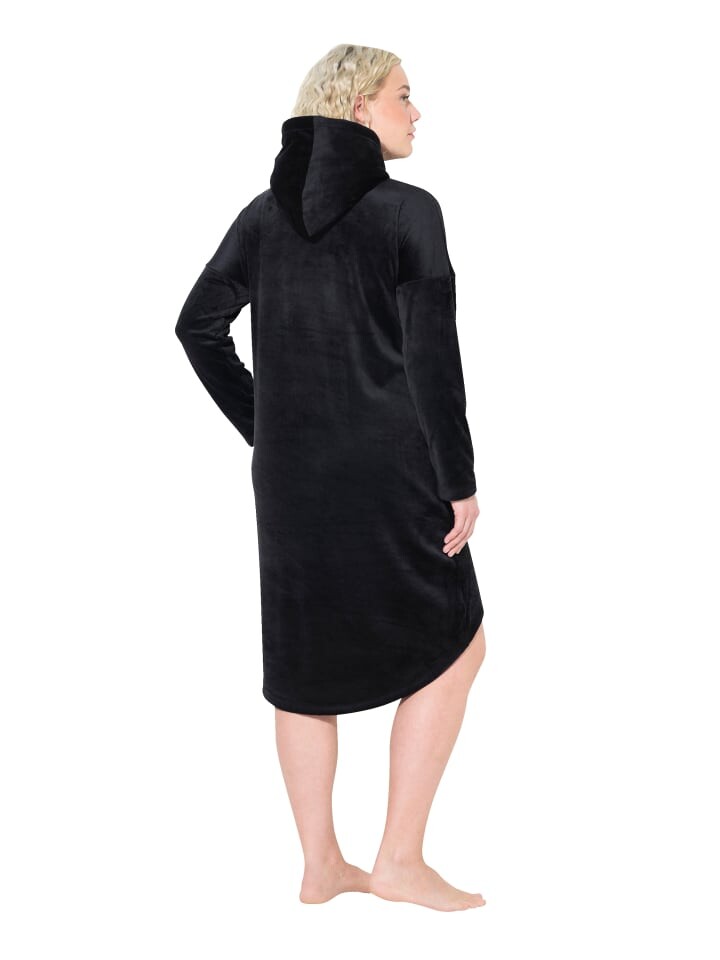 Очень удобное платье А-силуэта для дома, выполненное из приятной мягкой ткани, с капюшоном и завязывающимся ремешком. На груди небольшой узор из стразов. Заниженная линия плеча, длинные рукава. Карманы в боковых швах, удлиненный закругленный край сзади. Изготовлено из переработанных материалов.