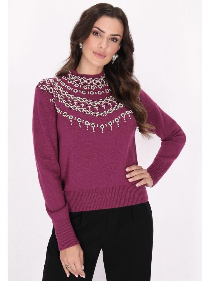 Поддайтесь очарованию этого свитера с длинными рукавами и водолазкой в рубчик. Украшенное витиеватым декоративным узором, напоминающим ожерелье или гирлянду, оно излучает праздничную элегантность. Многочисленные ряды украшений имеют различные формы и мотивы и придают изделию декоративность. Этот свитер с ребристым краем по краю и манжетами для плотного прилегания обещает тепло и стиль.