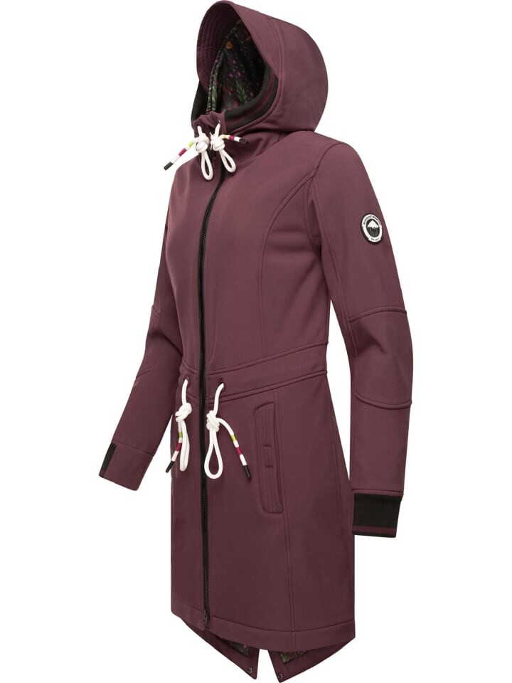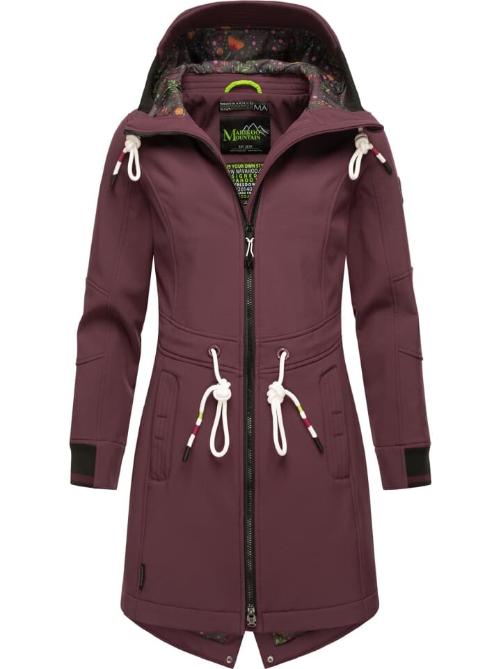 ВИД: Стильное длинное женское пальто из софтшелла с большим капюшоном, персикового оттенка, игривой внутренней подкладкой и множеством стильных деталей от Navahoo!