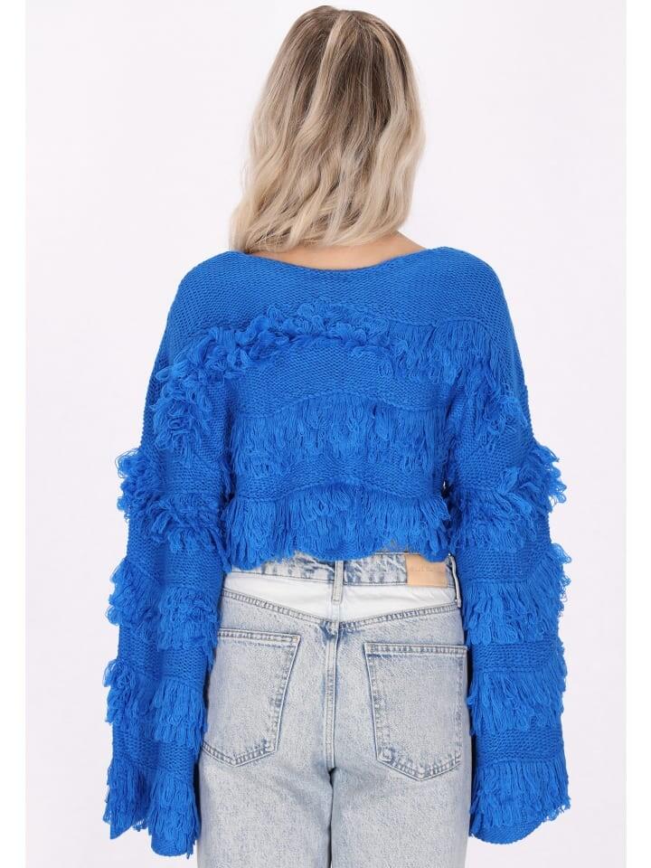 Этот стильный предмет одежды станет изюминкой вашего гардероба: короткий свитер впечатляет структурированным дизайном с бахромой на рукавах и подоле, которая придает ему игривый вид в стиле бохо. Широкий круглый вырез и слегка расклешенные манжеты подчеркивают свободный силуэт, а рельефные нити создают уникальный трехмерный эффект. Идеально подходит для тех, кто ищет повседневный, но шикарный образ.