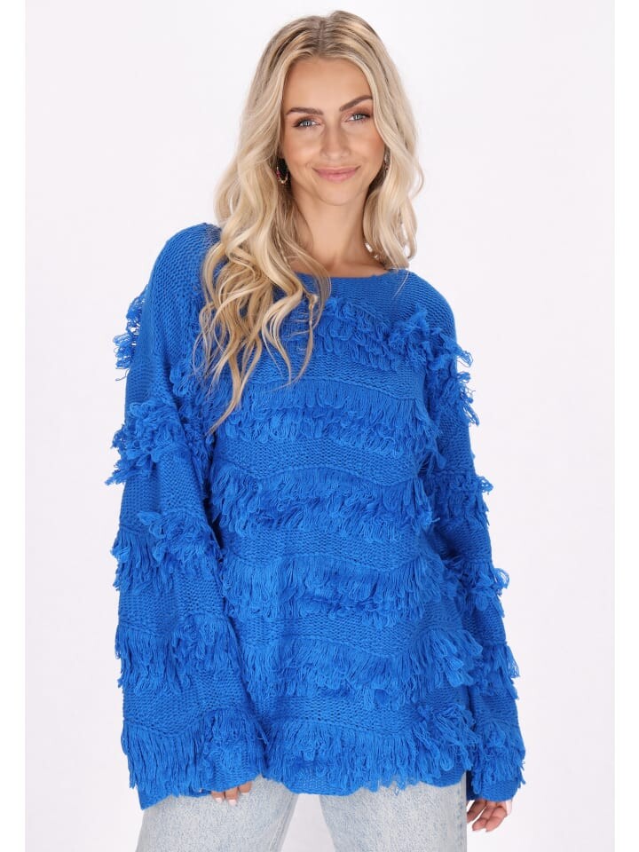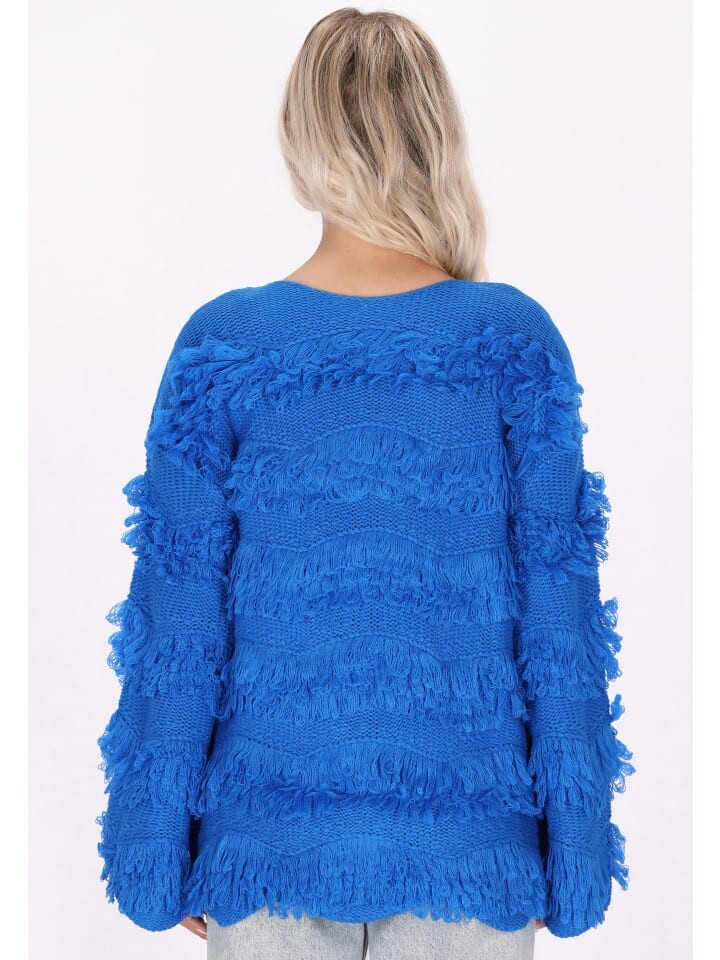 Откройте для себя наш женский свитер с круглым вырезом и длинными рукавами. Эта модель имеет несколько слоев ткани с бахромой, что создает стильный, многоуровневый вид и интересный вид. Низ, манжеты и горловина выполнены более тонкой вязкой, которая красиво контрастирует со структурированной основной частью. Благодаря свободному крою этот свитер идеально подходит как для повседневного, так и для модного образа.