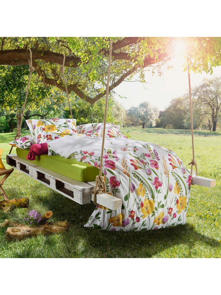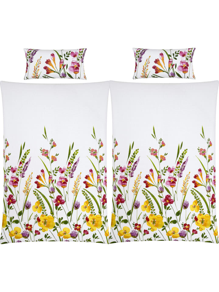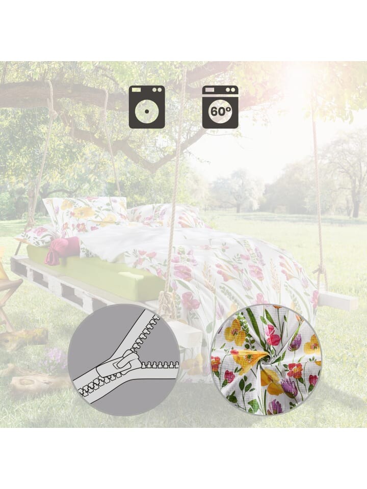 Экономный комплект постельного белья из хлопчатобумажной ткани Erwin Müller, 4 шт. Понежьтесь в море ароматных цветов. На этой веселой цветочной поляне можно спокойно помечтать. Двусторонняя наволочка обеспечивает разнообразие. Наслаждение теплыми летними ночами, потому что воздушное, легкое, приятное для кожи и уравновешивающее температуру качество прочной креповой структуры обеспечивает оптимальную циркуляцию воздуха. Вы быстро удивитесь простоте ухода: несложное постельное белье практически не гладить - просто стирать, сушить и быстро надевать благодаря застежке-молнии.