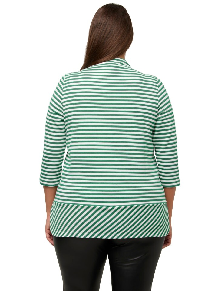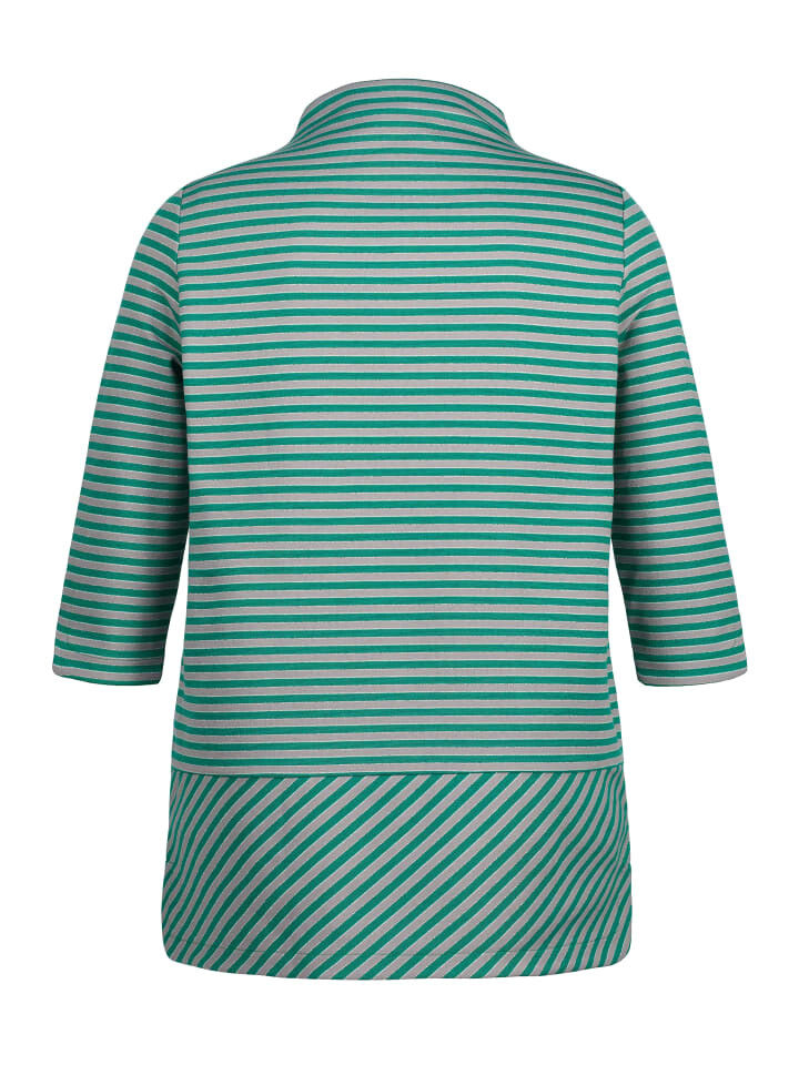 Футболка с сочетанием полосок и изящным металлическим эффектом. Широкий воротник-стойка, поперечный шов по низу и закругленные боковые разрезы для большего комфорта. Рукава 3/4 с закругленным низом.