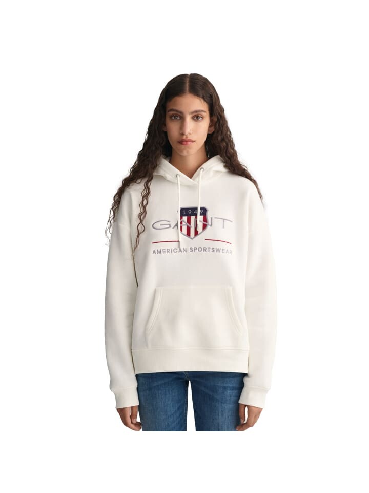 Стильное худи для женщин от бренда GANT. Приятная мягкая смесь хлопка, большая вышивка логотипа, карман-кенгуру, капюшон на шнурке.