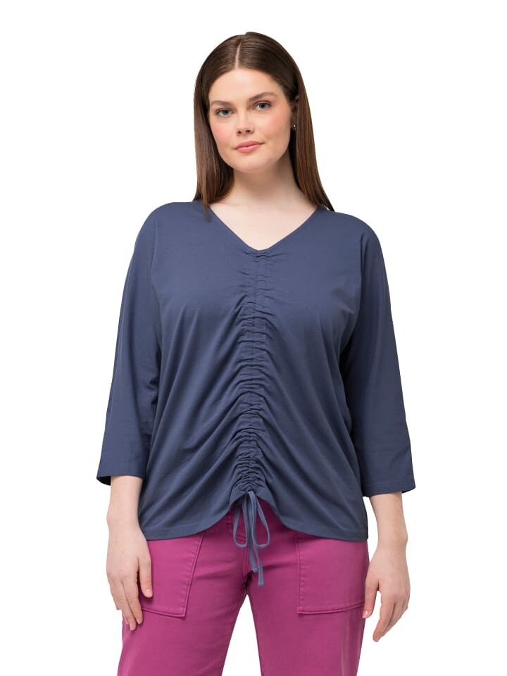 Футболка из натурального хлопка с рюшами спереди – всегда ваш желаемый силуэт. Округленный V-образный вырез, рукава «летучая мышь» 3/4. Органический; сертифицировано лицензией ECOCERT Greenlife № 152026.