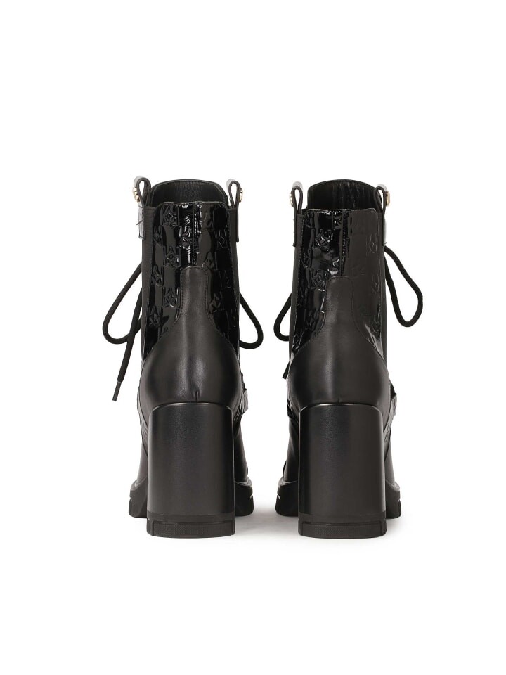 Черные ботинки с тонкой шнуровкой – исключительный выбор для тех, кто ищет стильную и удобную обувь. Эта модель стоит на широком каблуке и толстой подошве, что обеспечивает устойчивость и комфорт. Голенище украшено резинками, которые не только придают нотку современности, но и облегчают регулировку обуви по ноге. К дополнительным декоративным элементам относятся вставки из лакированной кожи, украшенные рельефными вензелями, что подчеркивает элегантность и уникальность этой модели. Эти ботинки сочетают в себе утонченность шнуровки с современными акцентами, создавая гармоничное и стильное целое.