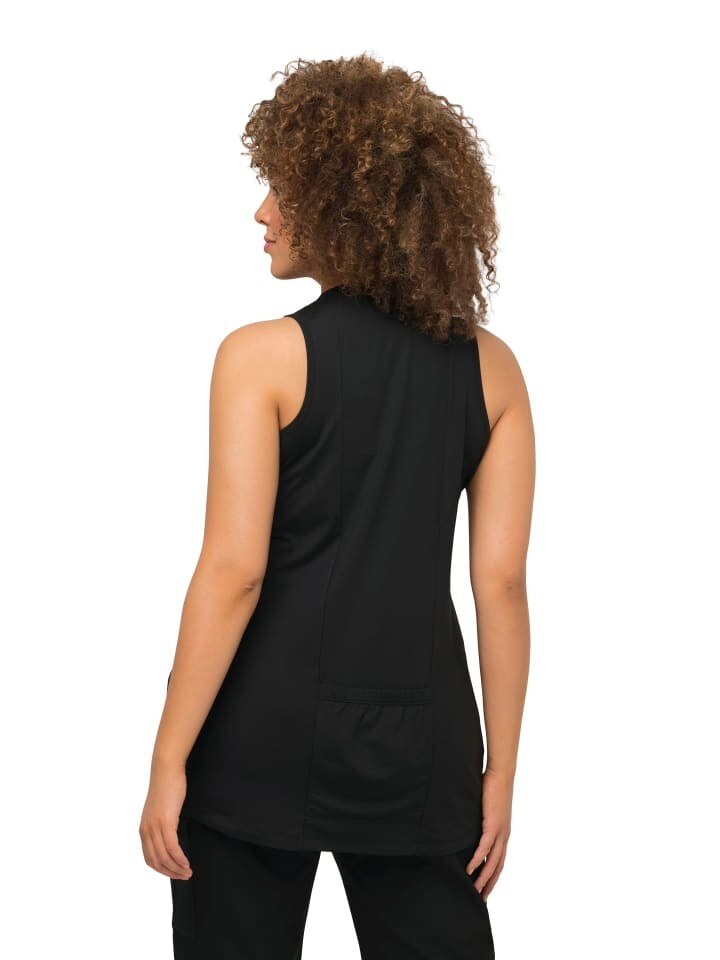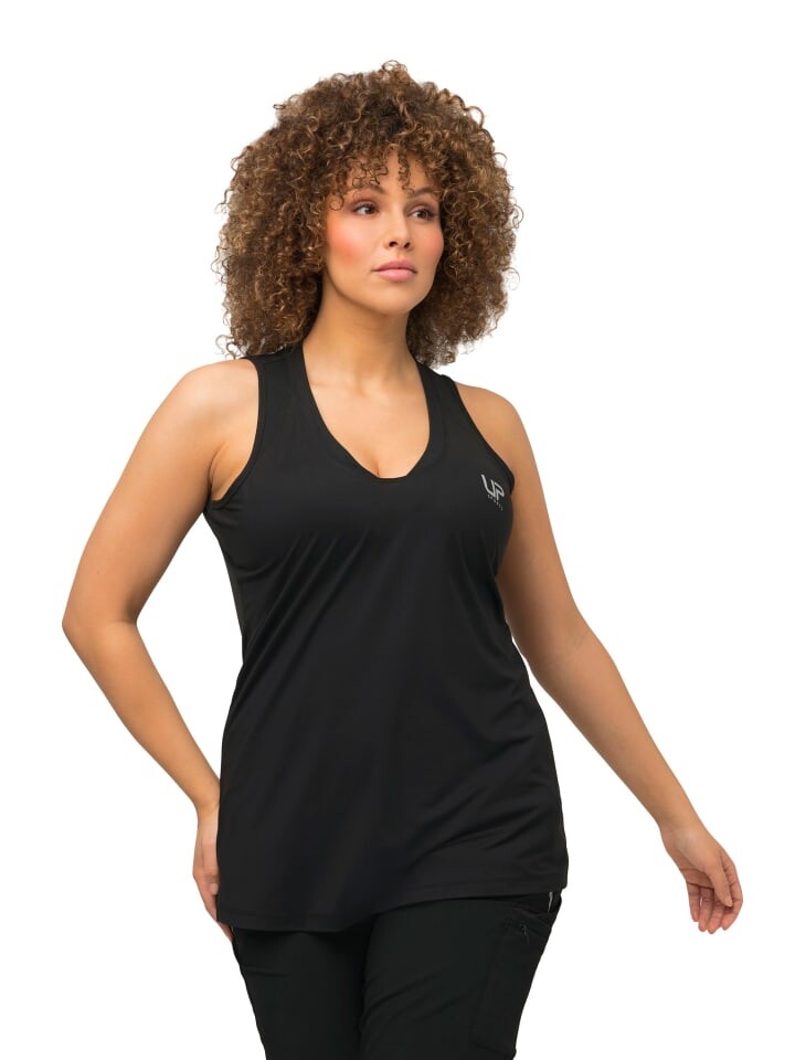 Функциональный топ, облегающий крой, выполнен из дышащего трикотажа с функциональными вставками, на подоле сзади карман для смартфона или чего-то подобного. Изготовлен из переработанного полиэстера. Высушите быстрее с помощью QuickDry. V-образный вырез, плоский воротник-стойка, закругленный низ с разрезами по бокам. Без рукавов.