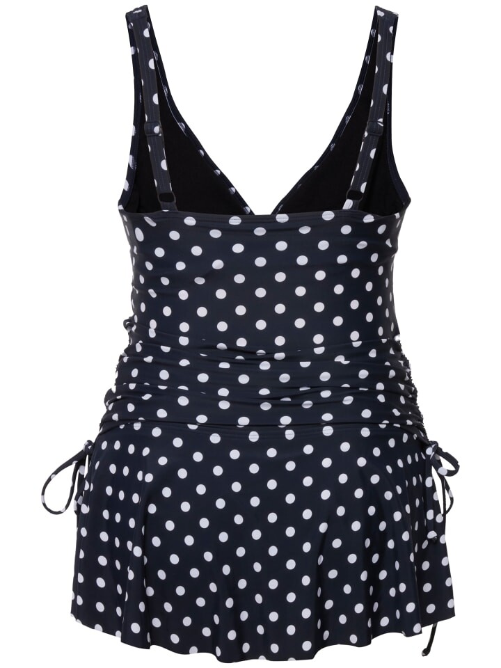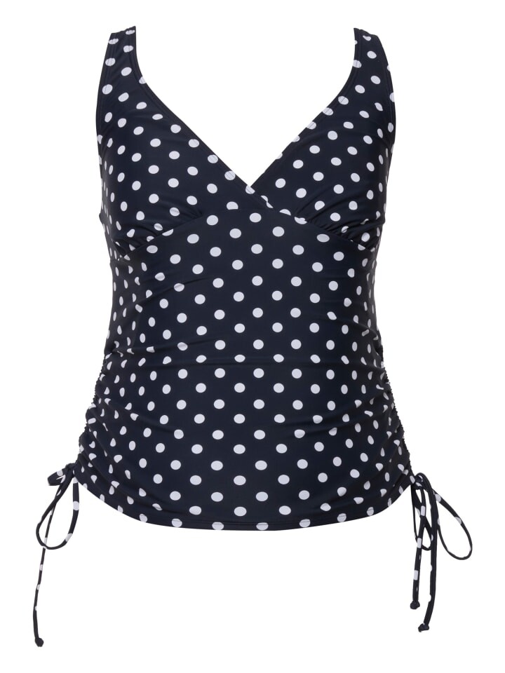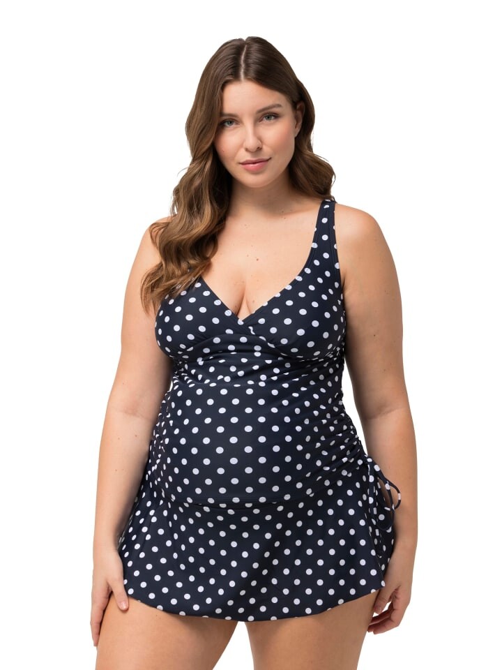 Танкини Bellieva, двойка, в горошек. Удлиненный топ без мягких чашек, по бокам оборки с тесьмой для регулировки. Регулируемые бретели, очень гибкие на разных стадиях беременности. V-образный вырез с рюшами спереди – идеален для кормящих женщин. Пояс под грудью, подкладка спереди. Оборчатый низ, закрывающий трусы в тон. Широкие, приятно эластичные манжеты поддерживают живот.
