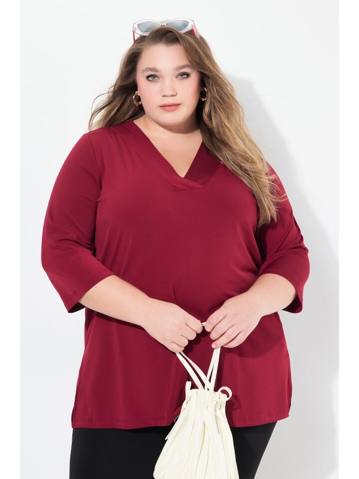 Длинная рубашка из мягкого трикотажа с V-образным вырезом, рукавами 3/4 и разрезами по бокам.