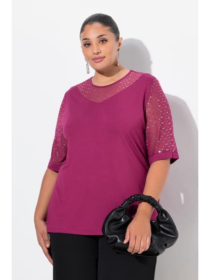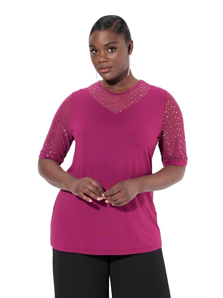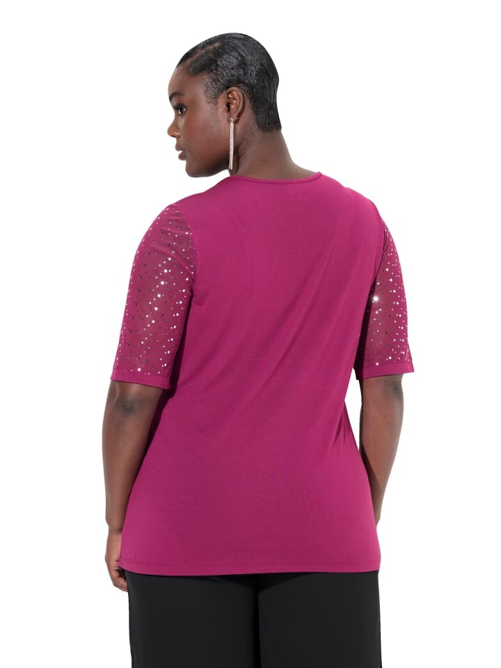 Футболка классического кроя. Двухслойное: перед и половина рукава украшены сеткой и блестящими пайетками. Спереди на подкладке из непрозрачного трикотажа. Круглый вырез с оптическим V-образным вырезом.