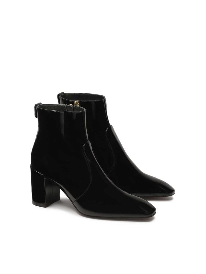Черные ботинки на широком каблуке сочетают в себе элегантность и современный дизайн. Простой материал верха из блестящей лакированной кожи придает им изысканный вид и делает их чрезвычайно привлекательными. Особенностью этих туфель является тонкий удлиненный нос, скошенный на конце. Застежка-молния позволяет легко надевать и снимать. Широкий каблук обеспечивает устойчивость и комфорт, что делает эти ботинки идеальным выбором для долгих дней или вечерних прогулок. Черный цвет сочетается со многими нарядами, от повседневных джинсов до более формальных вечерних платьев, что делает его универсальной обувью для самых разных случаев. Мягкая подкладка из овчины обеспечивает комфорт, а подкладка из тканевого меха создает ощущение тепла в холодные дни.