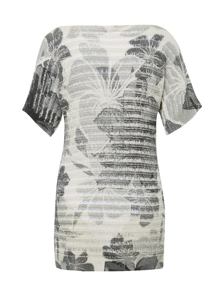 Пуловер модного фасона с вырезом «лодочкой» и заниженной линией плеч. Изысканная модель приобретает особый шарм благодаря гармоничному цветочному принту – какой дизайн! Эффектный вид с перекрестными ребрами выделяет его еще больше. Все это завершается ленточной пряжей с красивыми элементами ажура. Удивительно воздушная ткань с хлопком для высокого уровня комфорта. Длина около 67 см по размеру. 46, размер около 63 см. 23.