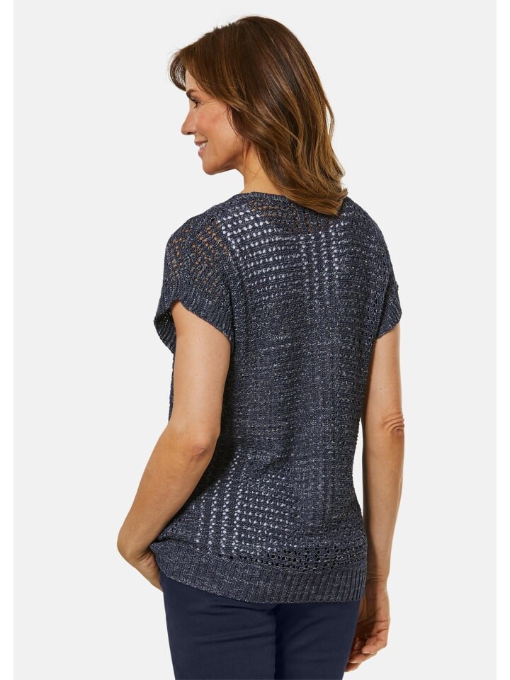 Свитер выполнен из эффектной двухцветной ленточной пряжи. В сочетании с красивой ажурной структурой и чередованием продольных и поперечных ребер он быстро становится привлекательным. С визуально удлинённым V-образным вырезом, заниженной линией плеч и ребристыми манжетами. Изделие яркого цвета, простое в уходе и очень удобное в ношении. Длина около 67 см по размеру. 46, размер около 63 см. 23.