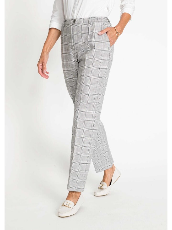 Брюки в клетку, привлекающие внимание своим привлекательным дизайном: аккуратную клетку в неподвластных времени цветах можно сочетать практически со всеми другими моделями. Изготовлен из эластичной качественной ткани с добавлением натурального хлопка и вискозы. Содержание полиэстера гарантирует, что ваши любимые брюки будут невероятно удобны в носке и за ними абсолютно легко ухаживать. Классический крой с фигурным поясом, практичными петлями для ремня и боковыми карманами. Ширина по низу CARLA ок. 38 см, ANNA ок. 42 см. Узкая ширина штанин.