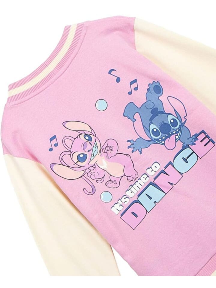 В дизайне куртки сочетаются нежно-розовый и кремовый цвета рукава, а спереди изображен популярный диснеевский персонаж Стич. На спине Стич и Ангел радостно танцуют под аккомпанемент надписи «Пришло время танцевать». Ребристые манжеты, V-образный вырез и планка с пуговицами идеально дополняют дизайн.