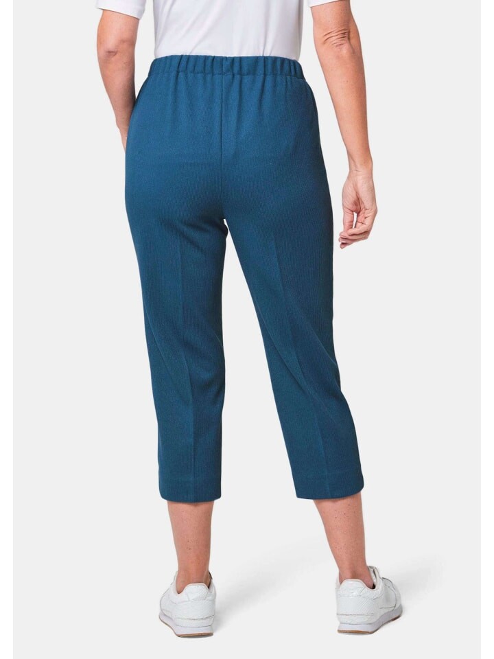 Брюки в рубчик 7/8, которые отличаются максимальным комфортом и идеально подходят для длительных поездок на автомобиле или автобусе. Прочный трикотаж приятно мягок, почти не мнется и держит форму. Благодаря несложному качеству стирки-сушки он всегда быстро готов к использованию. Оснащен удобным поясом, обеспечивающим комфорт при ношении, и стеганой окантовкой, подчеркивающей фигуру. Ширина прямой штанины. Ширина по низу около 42 см.