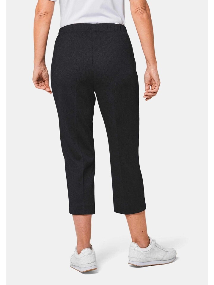 Брюки в рубчик 7/8, которые отличаются максимальным комфортом и идеально подходят для длительных поездок на автомобиле или автобусе. Прочный трикотаж приятно мягок, почти не мнется и держит форму. Благодаря несложному качеству стирки-сушки он всегда быстро готов к использованию. Оснащен удобным поясом, обеспечивающим комфорт при ношении, и стеганой окантовкой, подчеркивающей фигуру. Ширина прямой штанины. Ширина по низу около 42 см.