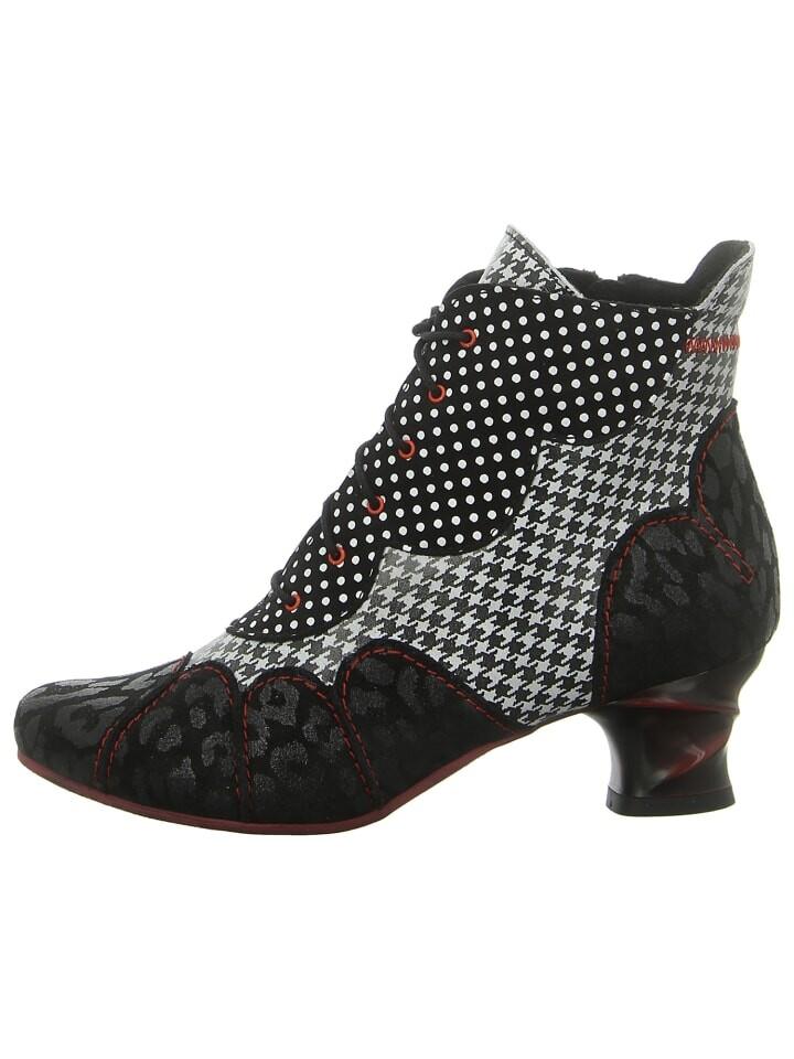 Эти необычные черные ботильоны на шнуровке от Simen, необычные, сразу порадуют вас. Ей прекрасно удается уникальное сочетание рокабилли, винтажа и ретро. Симпатичные черно-белые узоры и неотразимая форма привлекают к себе внимание. Каблук-воронка приподнимает линию ноги и придает модели сексуальный вид. Благодаря молнии и шнуркам обувь всегда идеально сидит на ноге. Не упустите это уникальное творение от Simen!