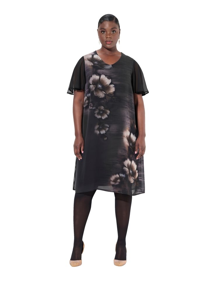 Платье А-силуэта, двухслойное. Воздушная сетка с цветочным принтом размера XL. V-образный вырез, рукава-чашки. Нижнее белье из непрозрачного трикотажа.